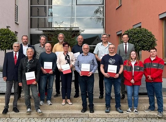 Das Foto zeigt von links erste Reihe: Kreisehrenvorsitzender Hartmut Bräuer, Norbert Rottmann, Reiner Wittmann, Gabriele Gräf, Waldemar Kolodziej, Michael Stephan, Jaqueline Hand und Marc-Justin Bräutigam vom Roten Kreuz in Schonungen, dahinter Bürgermeister Stefan Rottmann, Thomas Schmitt, Günther Pototzky, Wolfgang Kreutzer, Manfred Pfister und Landrat Florian Töpper. (Foto Ramona Gräf)