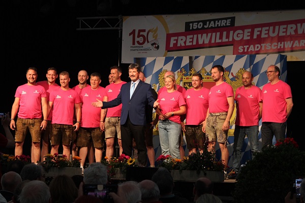 Auf dem Gruppenbild: Als Söder holte Krebs das anwesende Orga- und Helferteam der Feuerwehr auf die Bühne.