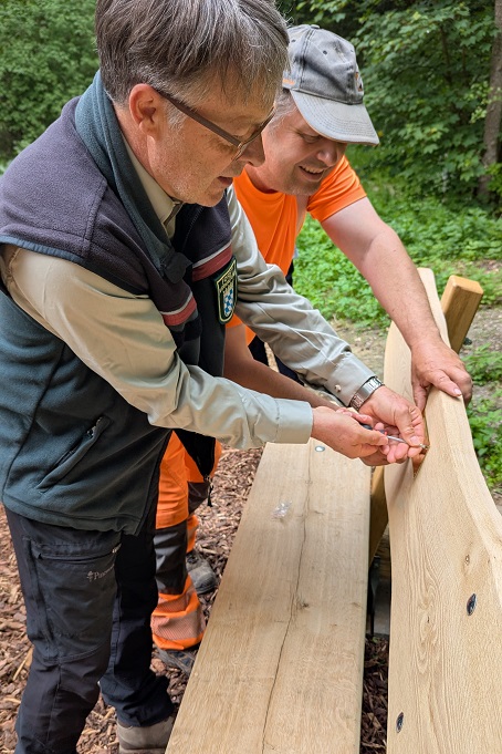 - Arbeiten auch jetzt noch Hand in Hand: Harald Spiegel und Bauhofsleiter Joachim Zehner befestigen gemeinsam das Namensschild an der Sitzbank