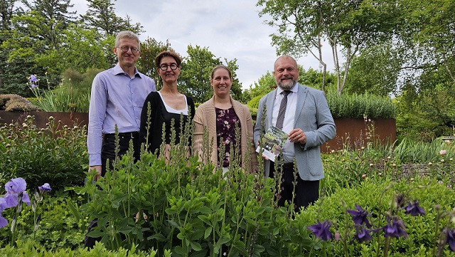 • Bernhard Muth (von links) und Simone Angst-Muth waren Gastgeber bei der Eröffnung des Tags der offenen Gartentür 2025 mit der Kreisfachberaterin für Gartenkultur und Landespflege, Jessica Tokarek, und Landrat Thomas Eberth, zugleich Vorsitzender des Kreisverbands für Gartenbau und Landespflege Würzburg.