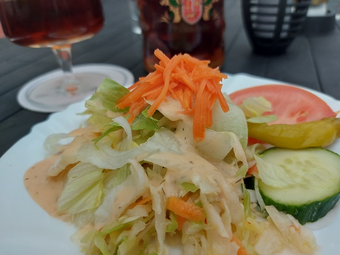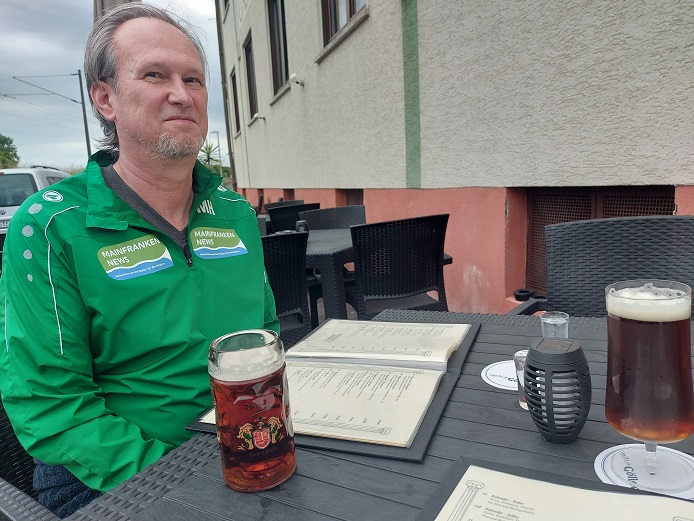 Und das als Schonunger… Aber diesmal war es soweit: Nach Fußballspielen in Dürrfeld und Wonfurt hatte der an sich geplante Grieche keine Kapazitäten mehr. Alsi wurde es ein Platz im Freien in einem kleinen Gehsteig-Biergarten direkt an der Bahnlinie mit drei vorbei rauschenden Zügen während des Besuchs.