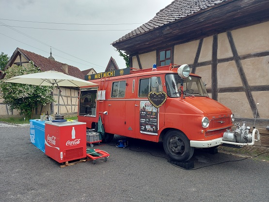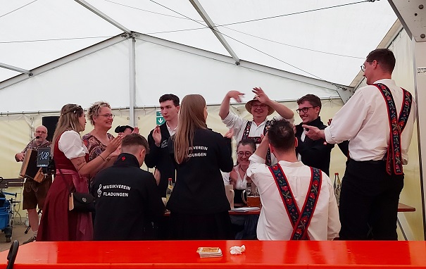 Egal, jedenfalls ging´s mit Schirm dann doch, das kleine, aber feine Fest im Fränkischen Freilandmuseum zu genießen. Ein paar Besucher waren mit dem Rhön-Zügle von Mellrichstadt angereist. Die meisten Gäste flüchteten in das zum Glück aufgebaute Festzelt. Dort sorgten der Musikverein Fladungen und die Rucksackmusikanten für prächtige Stimmung, während es draußen regnete.