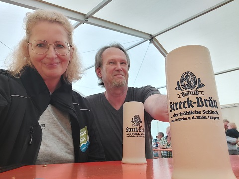 Dieses süfftige Bier, das es nun auch im Museumsladen abgefüllt in 1-Liter-Bügelverschlussflaschen gibt, ist ein Gemeinschafsprodukt der Privatbrauerei Friedrich Düll (Hopfen), Friedbert Stumpf aus Bad Neustadt (Brauvorgang und die Gärung), dem Gemeindebrauhaus Unterwaldbehrungen (Schroten), der Rhön Malz GmbH aus Mellrichstadt, der Rother Bräu (Fassreinigung) und der Pax Bräu (Abfüllung der Flaschen). Ach ja: Die Krüge kamen von der Streck-Bräu aus Ostheim, in denen der fröhliche Schluck besonders gut schmeckte.