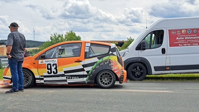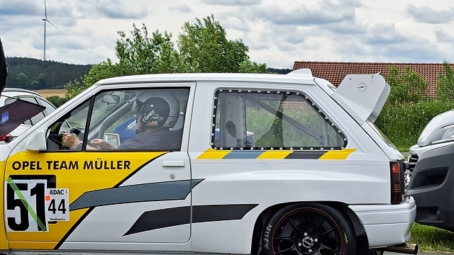 Bei den 1600 ccm Fahrzeugen der Klasse F9 waren drei Schweinfurter unter den fünf Startern. Der Sieg ging aber an den Bergrennfahrer Robert Machlonka (VW Polo), heiß umkämpft war der zweite Platz. Im Training hatte Ralf Kehr (Opel Corsa B) mit 8/100 Sekunden die Nase vor Michael Müller (Corsa A), nach dem ersten Lauf war es genau anders herum und Müller lag mit 17/100 Sekunden vorne. Die Entscheidung viel im letzten Lauf, Müller legte vor, doch er riskierte zu viel, kam auf Gras neben der Strecke und drehte sich und auch noch 18 Sekunde an Strafzeit kam hinzu. So freute sich der 2.Sportleiter Kehr über den zweiten Platz vor Sebastian Happ (AMSC Hammelburg) und Uwe Müller freute sich über den vierten Platz, es war wohl Michaels Vatertaggeschenk.