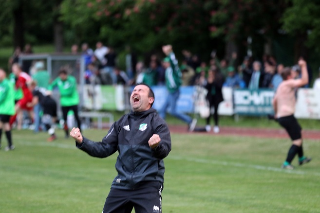 Warum das Bild: Jubelbilder schon vor der Relegation: Bücholds Trainer Niko Wolf feierte den Last Minute-Sieg in Grettstadt.