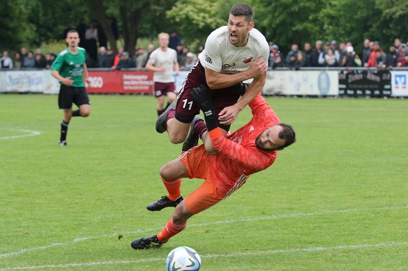 Warum das Bild: Ausnahmsweise mal eine Spielszene, noch dazu eine ziemlich entscheidende. Denn eigentlich hätte Ostheims Keeper Lukas Heinrich nach dieser Notbremde an Herbstadts Peter Kürschner durchaus auch vom Platz fliegen können. Er bekam nur Gelb.