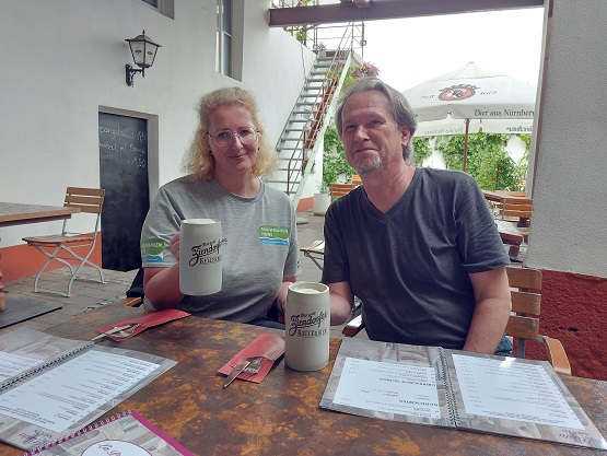 Drinnen duftete es wunderbar, die Gäste aus Schonungen und Bad Neustadt entschieden sich dennoch für einen Platz im überdachten Hof zu ein paar Weißbieren der Brauerei Tucher und Kellerbieren aus Zirndorf.