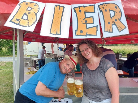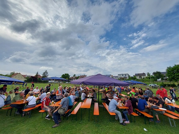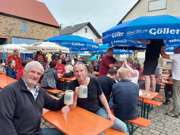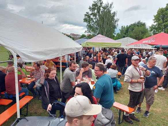 Dann zurück nach Schleerieth, wo eindeutig die meisten Menschen am Sportplatz weilten. Es gab hier ein Kreuzbergbier, ausgeschenkt in einem Roth-Bier-Glas. Sogar die Bänke entlang des Feldes, auf denen normalerweise die Zuschauer beim Fußball sitzen, waren belegt. Nette Gesellschaft fand sich schnell, eine Plauderei mit SG-Spielertrainer Thorsten Büttner beendete den Besuch.