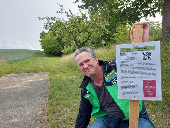 4,5 Kilometer sind es, also rund eine Stunde über Felder zu Fuß. Mit der Zwischenstation, der mysteriösen Brücke, dankenswerter Weise beschildert und mit dem Hinweis auf das Buch mit den 111 Orten in und um Schweinfurt, die man unbedingt mal gesehen haben muss. Michael Horling sagt Danke.