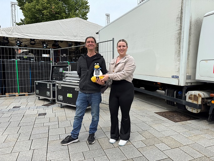- Das Produktionsteam vor der Bühne: Peter Hader und Annika Burmeister mit Helfer/Maskottchen.