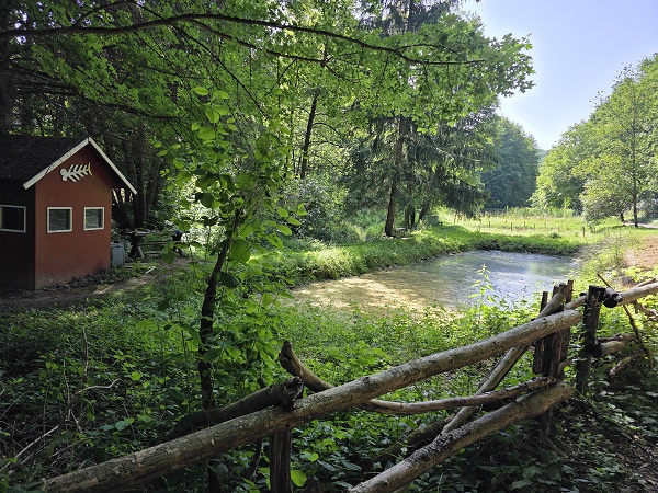 Die Wässernach selbst, die von Rednershof bei Abersfeld nach unten Richtung Main fließt, hat aktuell vor allem bei den Nebenarmen wenig bis kein Wasser. Schade. Sonst wär´s noch romantischer… Nach etwa 1,5 Kilometern erreicht man wieder den Schotterweg, biegt nach rechts ab, steht dann erneut vor einer Gabelung – diesmal ohne Schild.