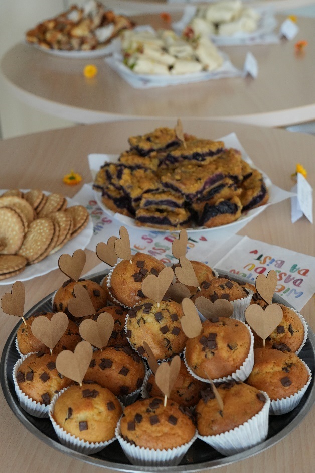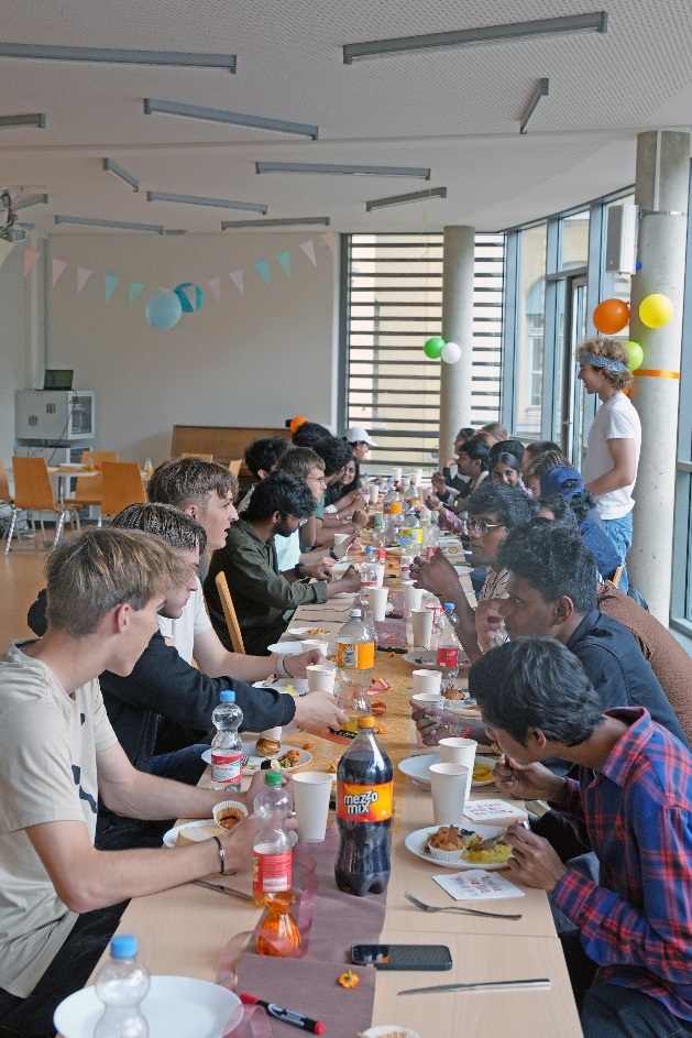 Nach monatelanger Planung konnten die Schülerinnen und Schüler die Studierenden endlich in ihren Schulräumen willkommen heißen. Zu Beginn stellten zwei von ihnen die Historie des Schulgebäudes und dessen Namensgeber den Studierenden vor und präsentierten das von ihnen ausgedachte Programm für den Nachmittag. Zur Stärkung gab es ein selbst gemachtes Buffet mit erfrischenden Getränken und vegetarischen Spezialitäten.
