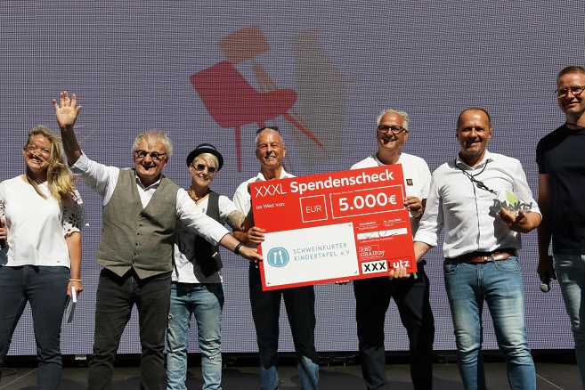 Auf dem Bild mit dem Spendenscheck links und vor dem Hang mit den Ausbildenden mit den sechs Personen von links: Stefan Labus (Vorstand der Kindertafel), Sorya Lippert (2. Bürgermeisterin der Stadt Schweinfurt), Rainer Zink (2. Vorstand der Kindertafel), Alois Kobler (Deutschland CEO von XXXLutz) sowie Peter Kruse und Steffi List (Botschafter und Botschafterin der Kindertafel).