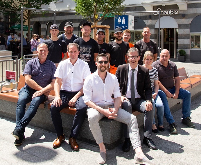 - Oberbürgermeister Christian Schuchardt (sitzend, 3.v.re.) und Stadtbaurat Benjamin Schneider (sitzend 2.v.li.) mit Mitarbeitenden aus der Stadtplanung, dem Bauhof und dem Gartenamt, die den Platz umgestaltet haben.