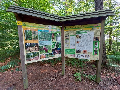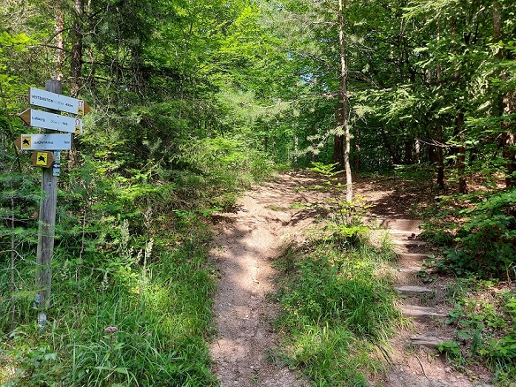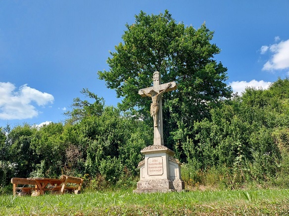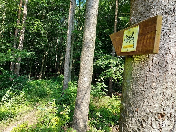 Richtung Norden und Kottendorf vorbei an der Kirche führt der Weg nur kurz an der Hauptstraße entlang ehe man am einem großen Kreuz nach rechts abbiegt. Nun ist die Wanderung gut beschildert mit zunächst einem Salamander. Es geht ebenerdig zunächst über gut ausgebaute Pfade, dann aber auch mal durch einen wilden Wald, wo man das Gefühl hat, hier wären seit Monaten keine Menschen mehr gewesen.