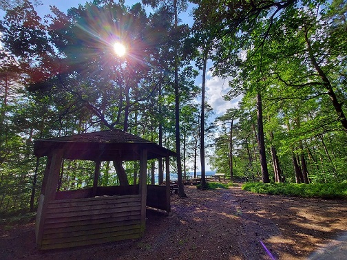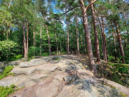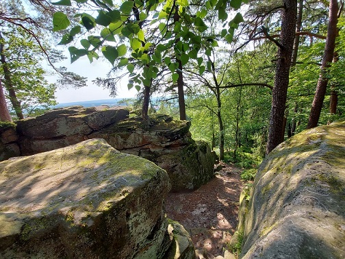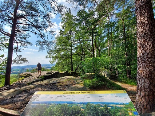 Vorbei am wenig spektakulären Jungfernkreuz, einem Stein, an dem angeblich mal ein Mädchen ermordet wurde, steht wenige hundert Meter weiter nun das Abbiegen nach links an und es wird erstmals ein wenig steil. Nun geht´s nach oben, wobei das Ziel relativ schnell erreicht ist: Der Veltenstein mit einer Aussichtsplattform mit weiten Blicken ins Tal.
