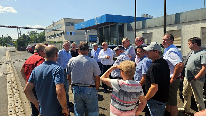 Den Abschluss der Fahrt bildete Langendorf, wo Mitte Mai der Spatenstich zum Kreisverkehr erfolgte. Dort gehen die Arbeiten zügig voran: Die neue Kreisstraße KG 37 ist bereits hergestellt. Bei sommerlichen Temperaturen von über 30 Grad konnten sich der Landrat gemeinsam mit den Kreisrätinnen und Kreisräten ein Bild von den schweißtreibenden Asphaltierungsarbeiten machen – die oberste Schicht wird bei rund 150° Grad verarbeitet und aufgetragen.