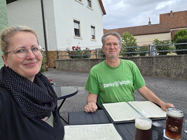 UNTERTHERES – mainfranken.news-Vielschreiber Michael Horling und seine alles fotografierende Partnerin Petra Moritz mögen den kleinen Gehsteig-Biergarten des griechischen Gasthofs Lammbräu „bei Iraklis“ am Bahngleis in Untertheres.