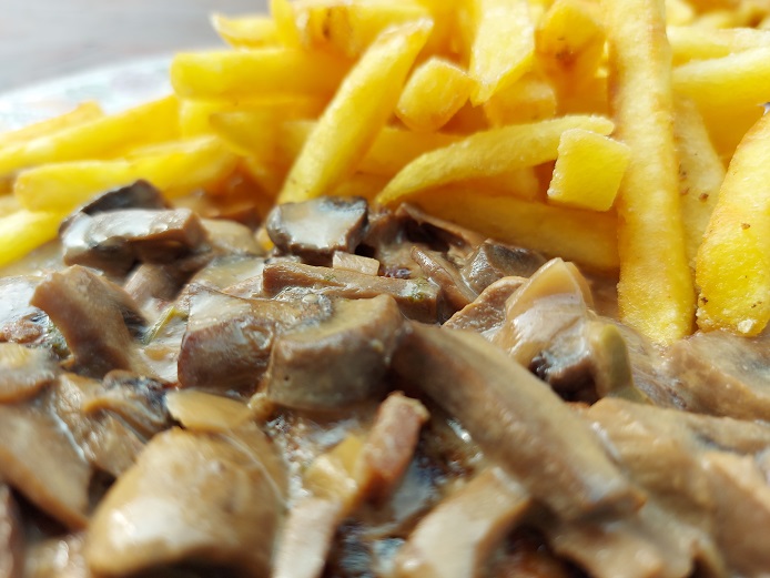 Denn von hier ist´s nicht weit nach Rüdenhausen in den schon oft erwähnten Brauerei-Gasthof Wolf. Dort gab´s die letzten Bockbiere, für Michael ein Jägerschnitzel und für Petra das Bauernschnitzel mit Speck, Zwiebeln und einem Spiegelei. Jeweils mit Pommes Frites, wobei auch Kartoffelsalat möglich wäre. Der Beilagensalat das es diesmal nicht auf das Foto geschafft.