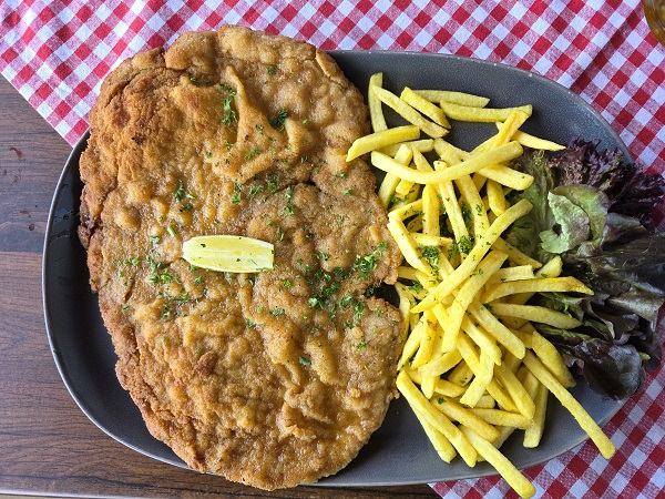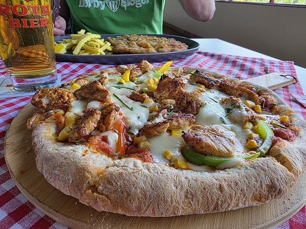 Die Premieren-Gäste entschieden sich für einmal die reichhaltig belegte Pizza Chicken und dann für das „normale“ Schnitzel (es gibt viele weitere…) mit Pommes Frites und einem Beilagensalat.