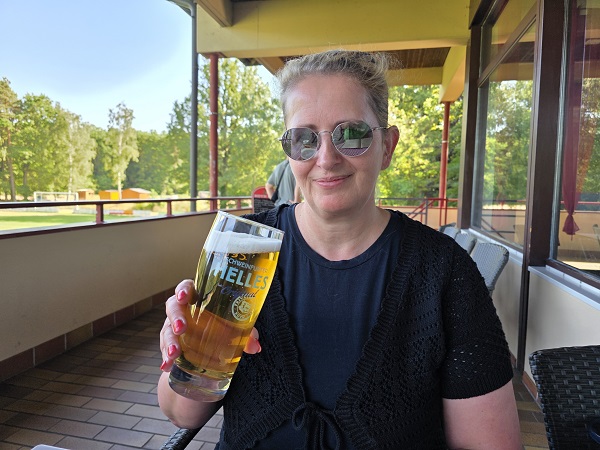 An einem Samstag war für 17 Uhr schon ordentlich was los, was ja immer ein gutes Zeichen ist. Gleich drei Stuben drinnen sorgen für viel Raum zur kühleren Jahreszeit. Doch es ist ja Sommer – und dafür gibt´s die überdachte Balkon-Terrasse mit dem Blick direkt auf das Spielfeld. Für Sportreporter Michael ein idealer Ort.