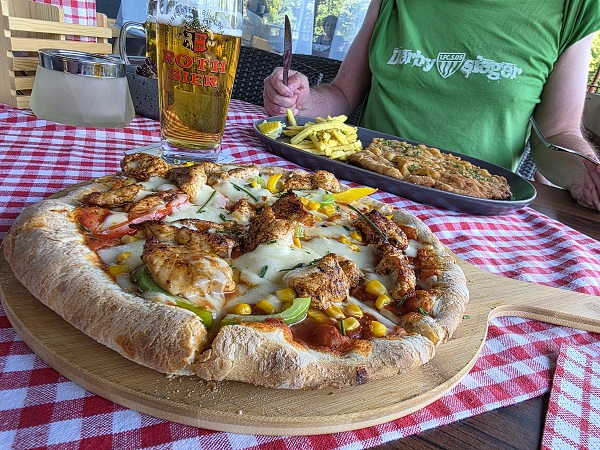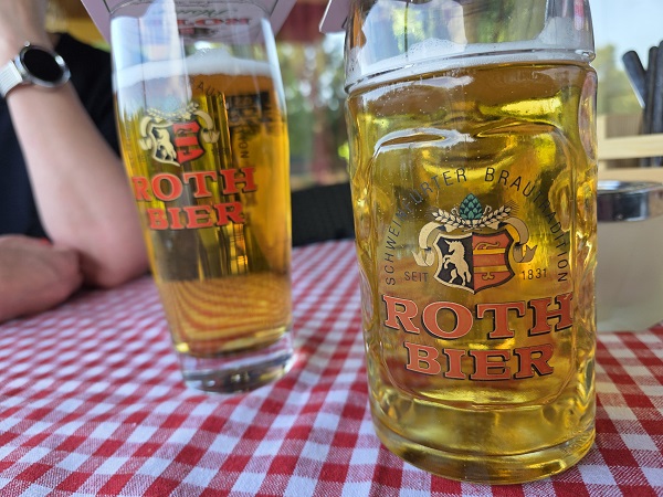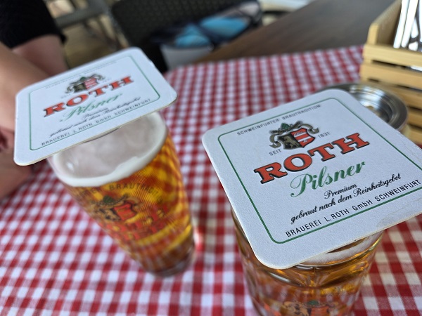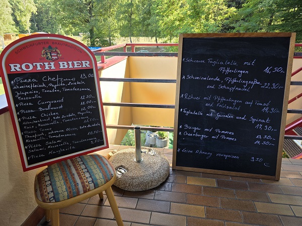 Zwei Biere der Brauerei Roth aus Schweinfurt, ein Helles und ein Pils, löschten zunächst bei den fast 30 Grad den ersten Durst beim Stöbern der Speisekarte und des zusätzlichen Tages-Angebots. Die Auswahl ist groß, das ist schon mal gut.