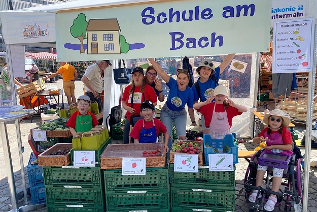 Mit einem Talker bewarben zwei der Kinder das Obst und Gemüse und lockten die Marktbesucher an ihren Stand. Andere Schüler begeisterten die potenziellen Käufer mit ihrem Wissen über Anbau und Ernte der Produkte. Dann wurden die Lebensmittel von den Kindern sorgfältig verpackt und vom Kassierer abgerechnet. Neben dem Spaß der Kinder stand auch der Inklusionsgedanke im Vordergrund. Kinder mit Behinderung verkaufen Obst und Gemüse an Menschen ohne Behinderung. Insgesamt konnten die Schüler an diesem Tag rund 150 Euro einnehmen und freuten sich am Ende des Markttages über ihr wohlverdientes Eis. Der restliche Betrag soll für den Aufbau eines eigenen Marktstandes an der Schule genutzt werden.