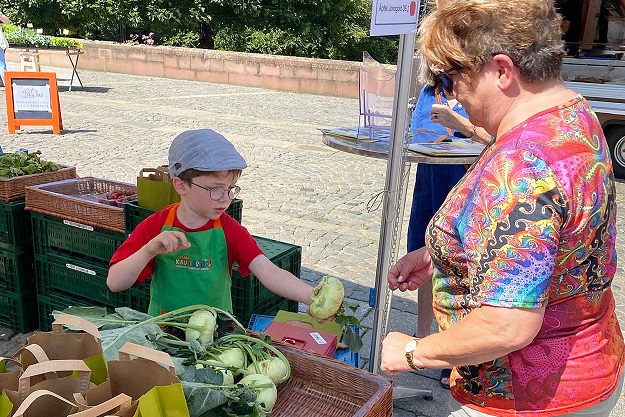 - Am „KidsMarktstand“ in Aschaffenburg: Mit viel Spaß und Wissen werden Obst und Gemüse an die Marktbesucher verkauft.