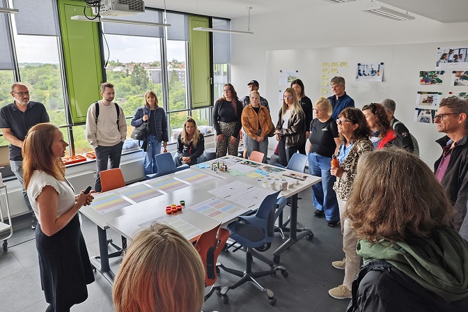 Im Kreativlabor für Innovationen und Ethik „InnovEthics.lab“ zeigt Prof. Dr.-Ing. Anne Heß, Prodekanin der Fakultät Informatik und Wirtschaftsinformatik, Angehörigen der Hochschule Ansbach Praxisbeispiele von studentischen Projekten der „Lego-Creativity“ (Foto: THWS/Markus Schäfer)