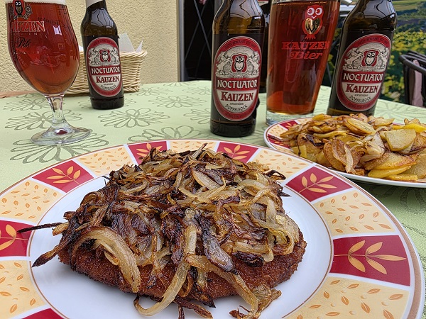 Michael entschied sich für das Zwibelschnitzel mit Bratkartoffeln, Petra für die Bratwürste mit dem eingelegten Sauerkraut und einem Brötchen dazu. Wer die Bilder sieht, wird erahnen, wie gut das schmeckte.