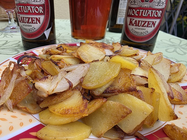 Zu ein paar Noctuatoren, den dunklen Doppelböcken der Brauerei Kauzen aus Ochsenfurt, gab´s zu jeweils einem Beilagensalat für die beiden Schonunger höchst unterschiedliche Speisen.