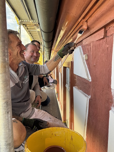 „Weil das Gebäude unter Denkmalschutz steht, gelten besondere Anforderungen: Farben, Putzstruktur und Materialien müssen mit der Denkmalschutzbehördeabgestimmt sein. Ziel ist es, das historische Erscheinungsbild originalgetreu zu erhalten und gleichzeitig für die kommenden Jahre zu schützen. Die Farben müssen auf 100 % mineralische Basis hergestellt sein. Alle Materialien sind darauf abgestimmt, für historische und denkmalgeschützte Gebäude verwendet werden zu können“, erklärt Malermeister Sascha Barth.