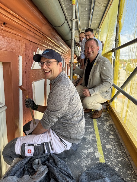 Ausgeführt werden die Arbeiten von der Firma Malermeister Barth aus Röthlein. Das Gerüst hat die Firma Berchtold gestellt.