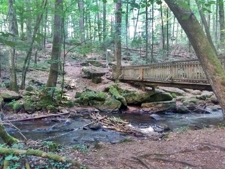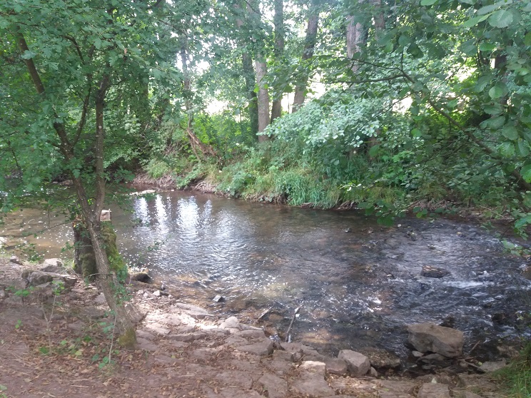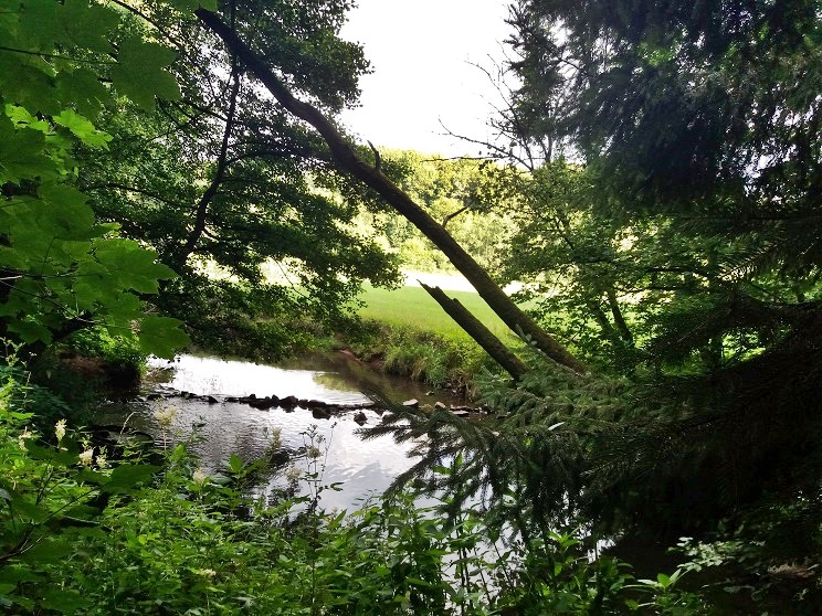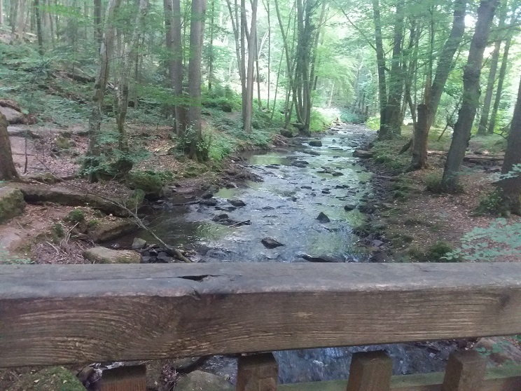 Dann geht´s weiter. Nach der „Reither Mühle“ hinein in den Wald. Und nun wird´s wildromantisch. Entlang des Bachs führen meist schmale und gar nicht so leicht begehbare Pfade selten mehr als leicht ansteigend die knapp fünf Kilometer zurück nach Oberthulba. Zwichendurch laufen wir nochmals unter der gewaltig wirkenden Autobahnbrücke hindurch.