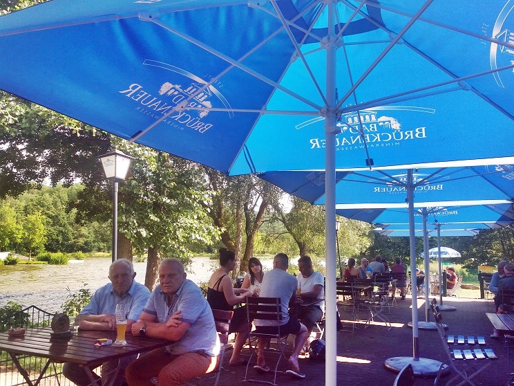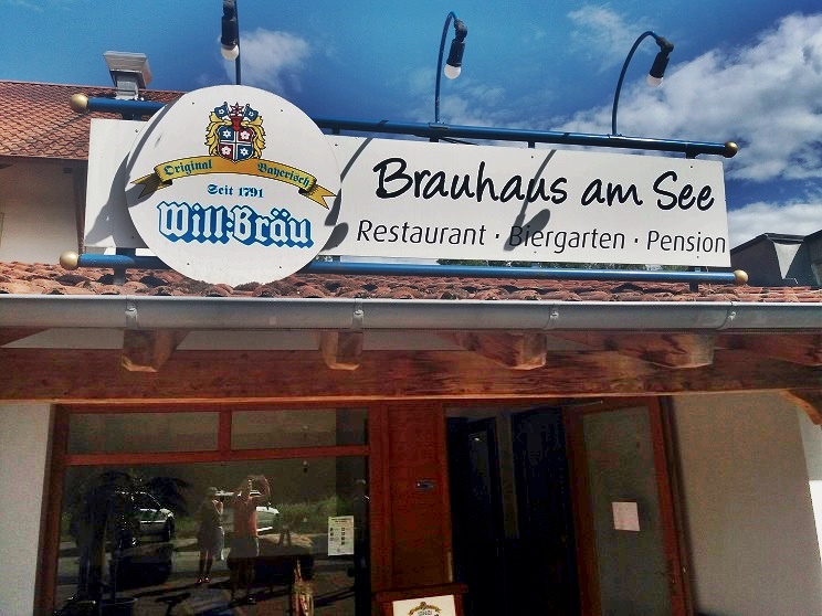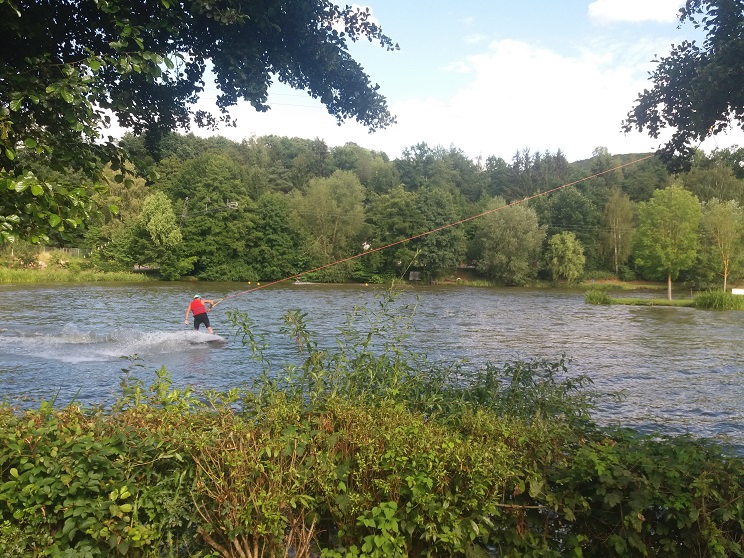 Am Thulbastadion vorbei laufen wir wenige Meter weiter zum Brauhaus am See, auf dem zahlreiche Wasserski-Sportler die automatische Anlage benutzen. Bei einer kleinen Stärkung auf der Terrasse macht das Zuschauen Spaß.