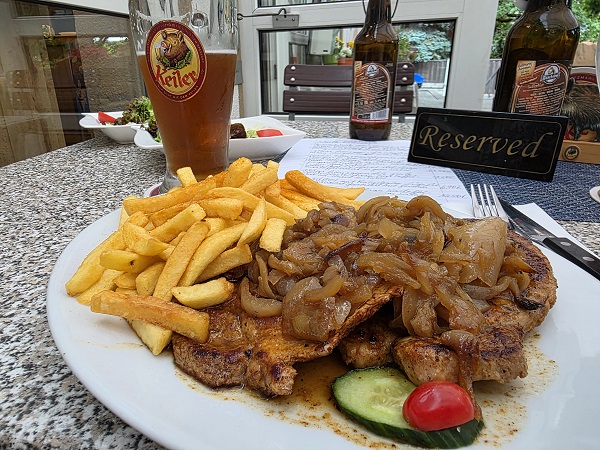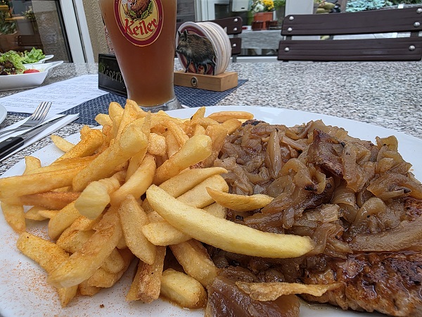 Dort gab´s zu ein paar guten Kellerbieren das Zwiebelsteak vom Schweinerücken mit natürlich vielen Zwiebeln, Pommes Frites und einem Beilagensalat. Wer die Bilder sieht, wird sich in etwa vorstellen können, wie lecker das war.
