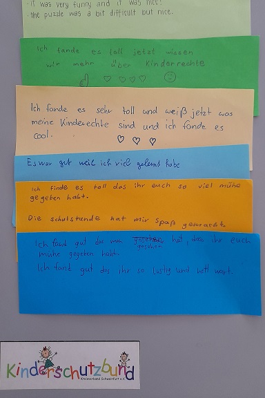- Feedback-Karten von Schülerinnen und Schülern der Wilhelm-Sattler-Realschule in Schweinfurt über den Projekttag, den THWS-Studierende in der Schule veranstalteten (Foto: Kinderschutzbund/Yvonne Bauer)