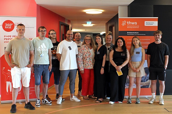 - Die Teilnehmenden des Brückenstudiums zusammen mit Monika Waschik (Mitte), Organisatorin der Abschlussveranstaltung (Foto: THWS/Susanne Reinhard)