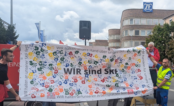 Um 12.05 Uhr folgte die nächste Welle: Knapp 1.500 Kolleginnen und Kollegen von SKF demonstrierten auf der Ernst-Sachs-Straße gegen die drohende Verlagerung von 1.300 Arbeitsplätzen in den Hafenbereich.