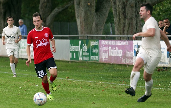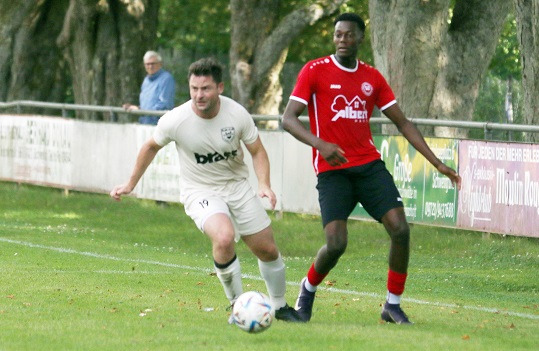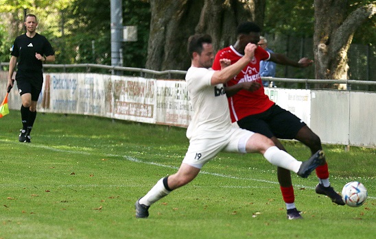 Nach 11 Minuten schickte Dominik Reiser seinen Mitspieler Adrian Hatcher in den freien Raum und der erzielte freistehend das 1:0. Danach wurden die Gäste stärker und erarbeiteten sich auch Möglichkeiten. Aber es war immer ein Dampfacher dazwischen. Die größte Chance dann in der 18 Minute. Ein Schuss von Patrick Amrhein wurde noch abgefälscht und der Ball landete an der Latte. Nach einer halben Stunde führte Simon Roppelt einen Freistoß schnell aus und bediente Adrian Hatcher. Der erteilte seinem Gegner und machte das2:0.