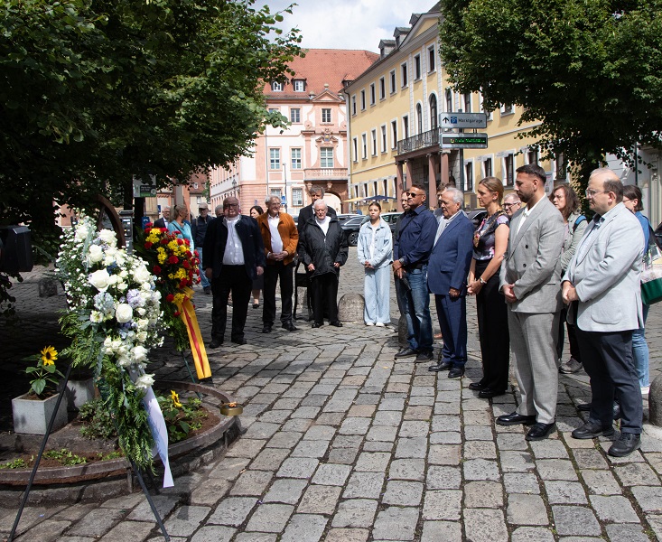 WÜRZBURG – Zum Gedenken an tausende Sinti und Roma, die durch das nationalsozialistische Regime in der Nacht vom 2. auf den 3. August 1944 in Auschwitz-Birkenau ermordet wurden, legte Bürgermeisterin Judith Roth-Jörg gemeinsam mit Nino Schneeberger vom Landesverband Bayern e.V. des Verbands Deutscher Sinti und Roma Kränze am Mahnmal auf dem Paradeplatz nieder.