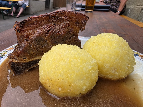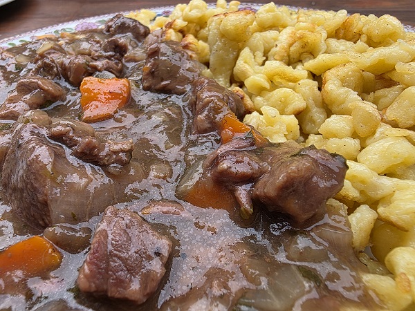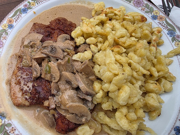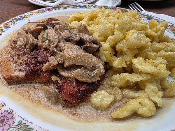 Diesmal sprach die Tageskarte dafür, sich für nur ein Gericht von der normalen Karte zu entscheiden. Wobei Petra ihr Jägerschnitzel (mit Beilagensalat) genauso mit Spätzle haben wollte wie Michael sie bekam zum Bierfleisch. Mit Rindfleisch und einer leckeren Soße.