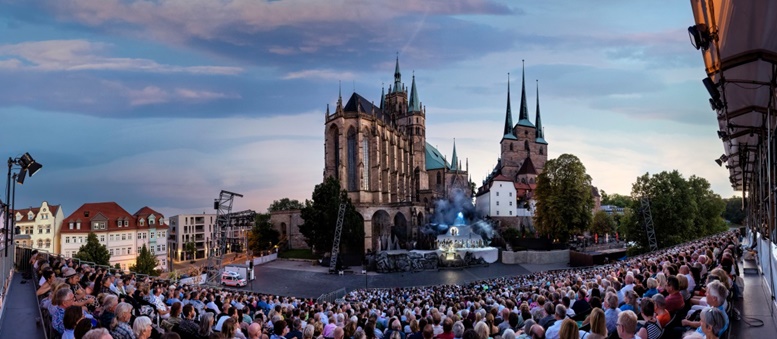 ERFURT – Seit 31 Jahren verwandelt das Theater Erfurt im Sommer die 70 Stufen vor dem Erfurter Dom und der Severikirche in Deutschlands schönste Open-Air-Bühne. Viele imposante Opern und berühmte Musicalproduktionen haben bereits hunderttausende Gäste aus ganz Thüringen, Deutschland und darüber hinaus nach Erfurt gelockt.