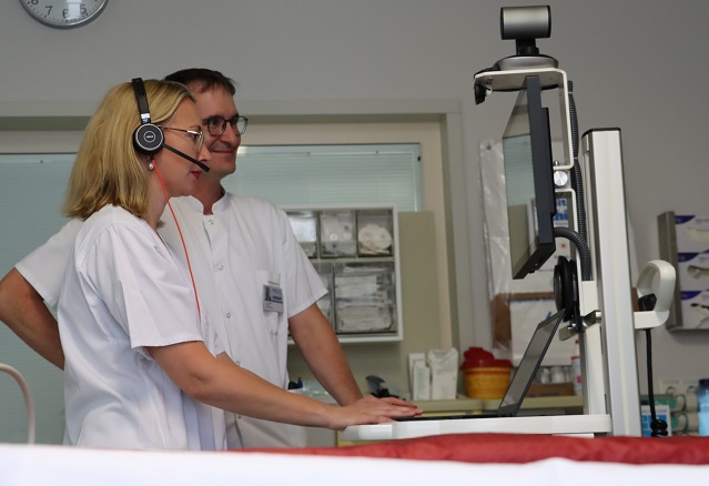 Zweiter Schwerpunkt beim Besuch der Gesundheitsministerin war die Telemedizin bei der Versorgung von Intensivpatienten. Live präsentiert wurde der am UKW entwickelte mobile Teleintensivwagen. Der Wagen, der mit mehreren hochauflösenden Kameras, Dokumentenscannern und vielen weiteren Anwendungen ausgestattet ist, steht im jeweiligen Partnerkrankenhaus. Die Ärztinnen und Ärzte des Universitätsklinikums schalten sich per Zoom in die Visite ein und erhalten einen umfassenden Eindruck vom Zustand der Patienten, so dass sie das Partnerkrankenhaus bei der weiteren Versorgung beraten können – dies zudem unter Berücksichtigung aller datenschutzrechtlichen Anforderungen.