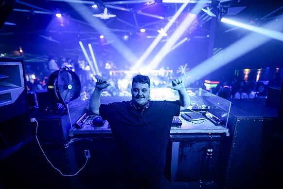 DJ G.O.G., selbst ehemaliger Jugendzentrumsbesucher und mittlerweile erfolgreicher DJ im Airport, an seinem „Arbeitsplatz“ bei der gut besuchten Würzburger School‘s Out Party