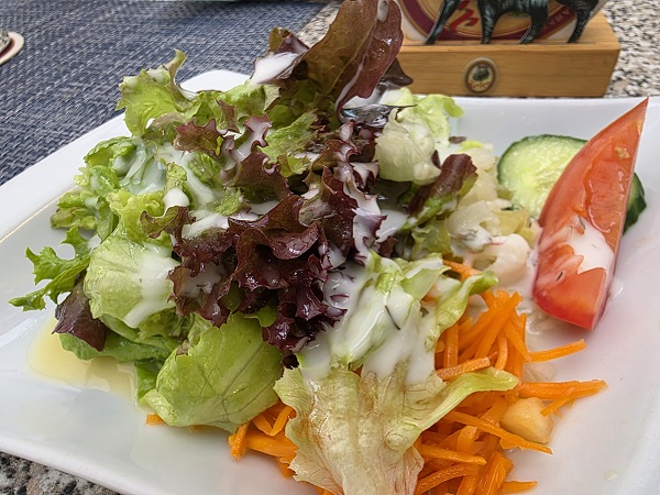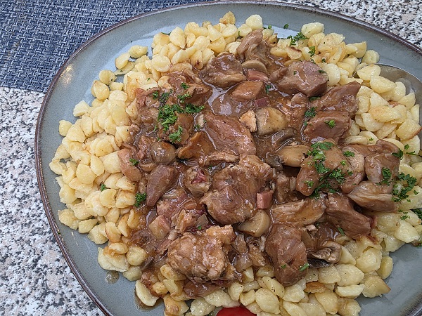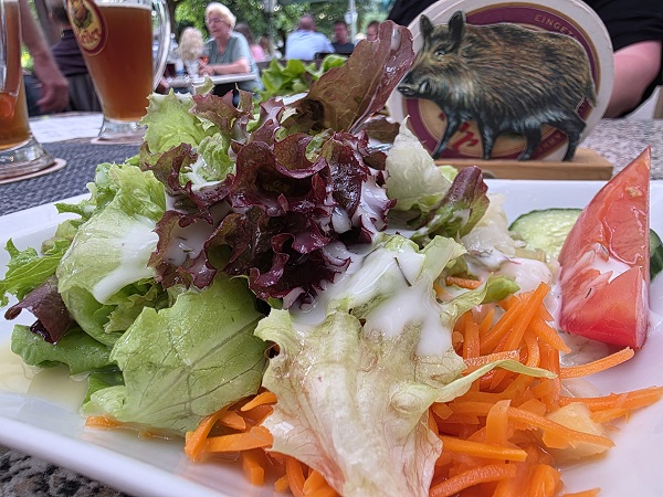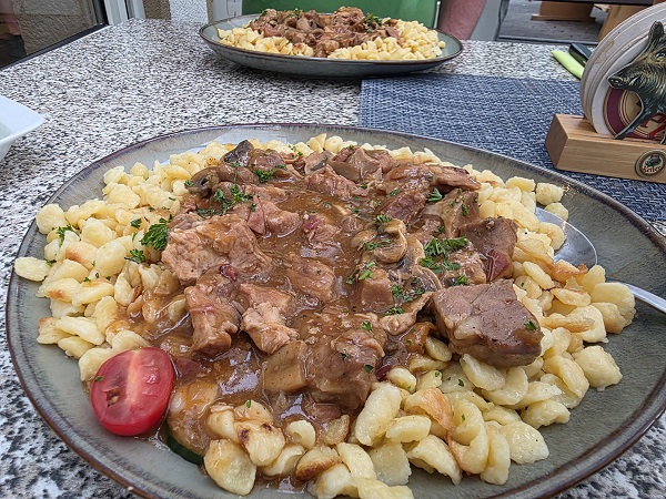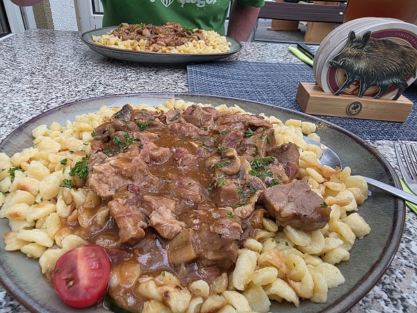 Beim letzten Besuch stand zwar auch ein Jägerbraten mit Nudeln auf dieser Tageskarte, aber das Schweinegulasch Hubertus mit Spätzle und Salat überragte wirklich alles. Mit Zwiebeln, Pilzen und Speck war es bestens gewürzt.