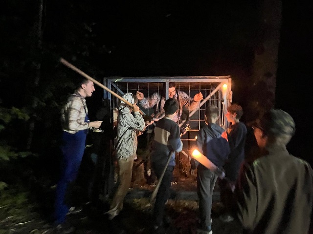 Foto Bürgermeister Mai (KJR Haßberge, Jonas Erickson): Die Gruppe „Jungs 3“ hat es beim finalen Nachtstationslauf geschafft, den zwielichtigen Bürgermeister Mai (Teammitglied Sebastian Kraus) hinter Gitter zu bringen.