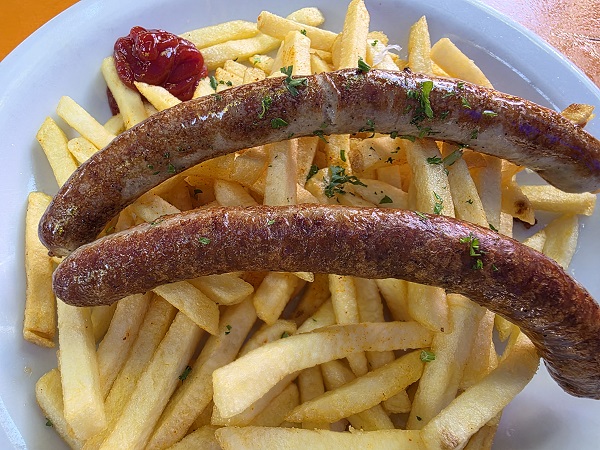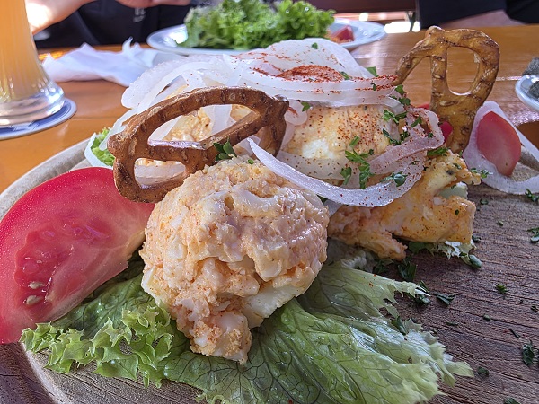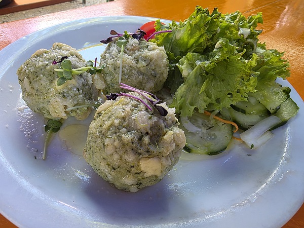 Auf die Teller kamen die vegetarischen Spinatknödel mit Salat von der Tageskarte, die fränkischen Bratwürste mit Pommes Frites und der Gerupfte mit ausreichend Brot. Schaut gut aus, oder?