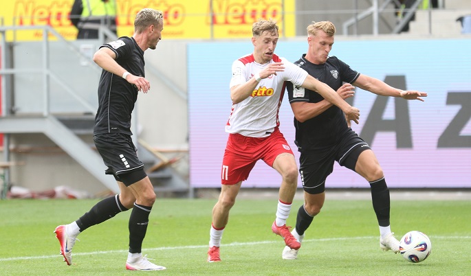 Es war wie eigentlich allen bisherigen Partien auch vor den 7553 Zuschauern in der Jahnarena so, dass wenig darauf hindeutete, ein Aufsteiger in die 3. Liga würde diesmal bei einem Zweitliga-Absteiger antreten. Kevin Fery hatte die Großchance zum 0:1. Wer weiß, was danach passiert wäre. Jedenfalls hatten die rund 500 mitgereisten Fans exakt 46 Minuten beste Hoffnung.