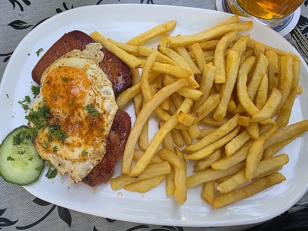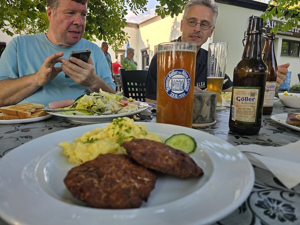 Michael wählte natürlich die Hackfleischküchli mit dem selbst gemachten Kartoffelsalat. Für Petra sollte es der Leberkäs´ sein mit einem Spiegelei und dazu Pommes Fristes.